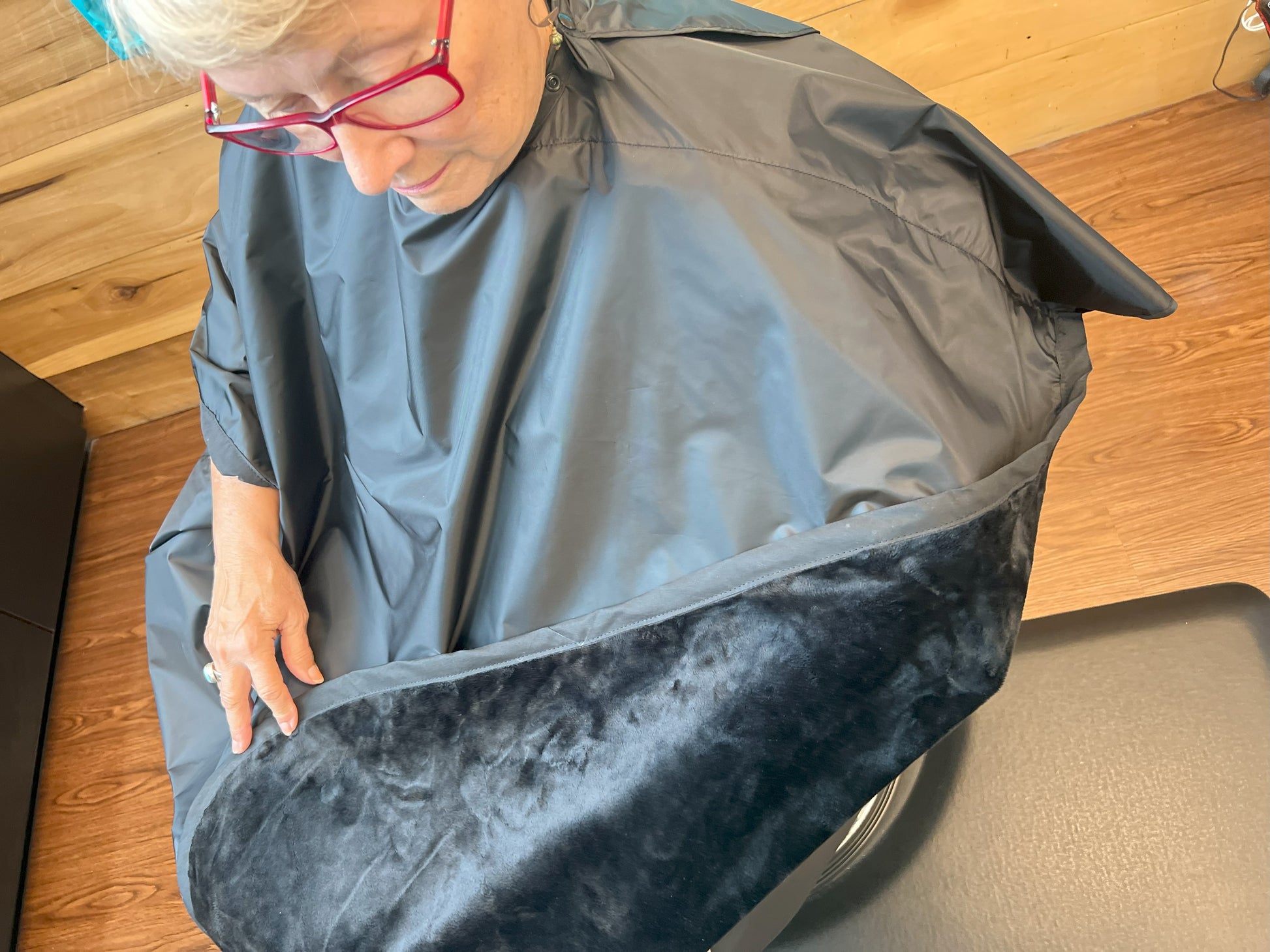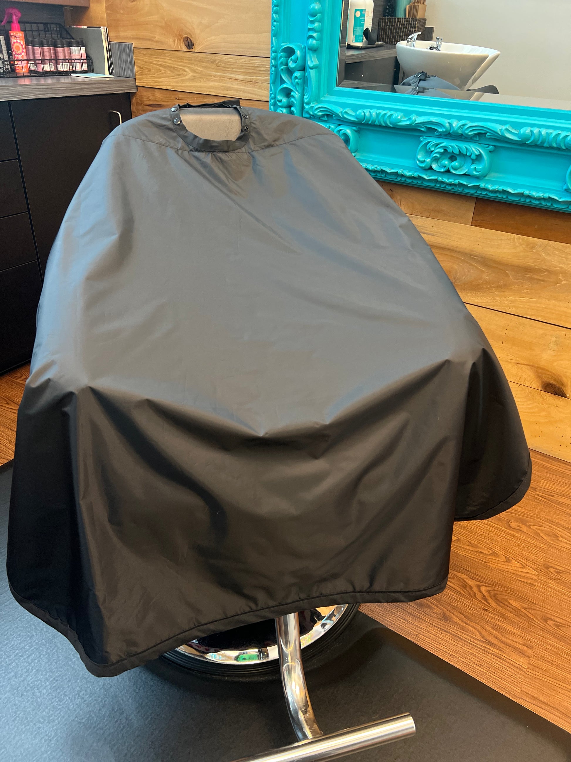 This new luxury salon cape features an ultra-soft, weighted black minky blanket lining delivers a cozy, soothing feel beneath a standard chemical cape. The snap closure with 6 snaps ensures a secure fit, while its handmade, double-sewn construction guarantees lasting quality. The chemical cape protects against stains, bleach, dyes, and is water resistant and is washable, dryable, and proudly handmade in the USA. Materials won't trap hair or bleach out. Cape measurements are 47" x 60"